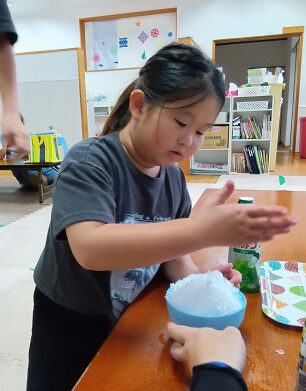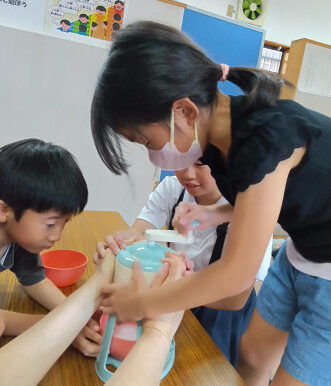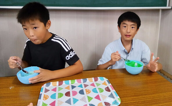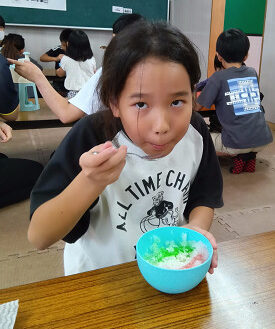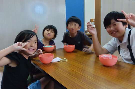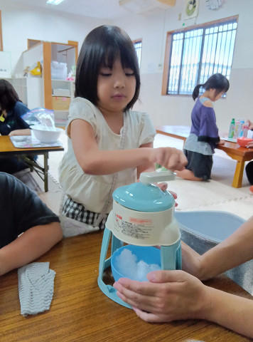 「自分の分は自分で作ろう」をめあてに慣れない手動のかき氷器に苦戦しながらも、力を込めてガリガリと頑張って削ることができました✨またグループのお友達はかき氷器を押さえたり削れた氷がおわんからこぼれないように回したりとみんなで協力することもできました😊