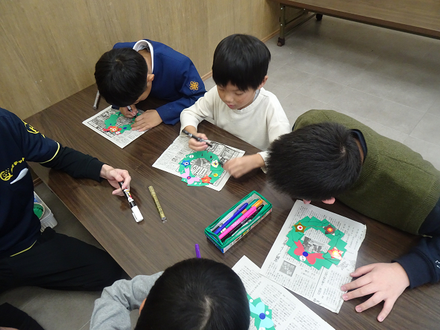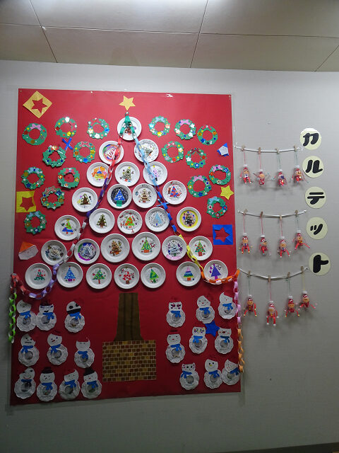 1週間かけてみんなで協力してクリスマスの壁面制作を行いました! ちぎり絵、紙皿刺繡、リース、雪だるま等沢山可愛らしい作品が出来上がりました✨