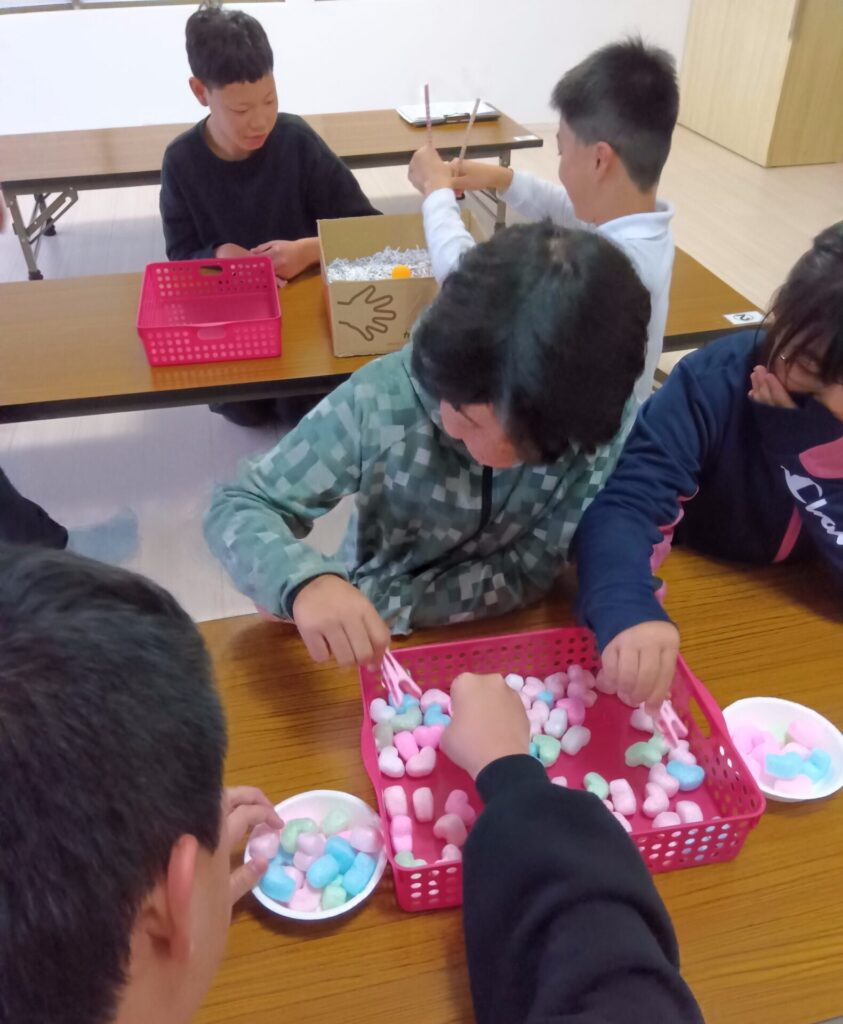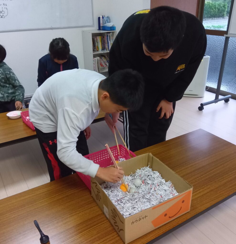 🥢手指訓練では「洗濯ばさみで🧽スポンジをつまんでお皿に移すゲーム」と「お箸を使って裁断紙の中から🏓ピンポン玉を探してカゴに移すゲーム」の2種類のゲームをグループで行いました。