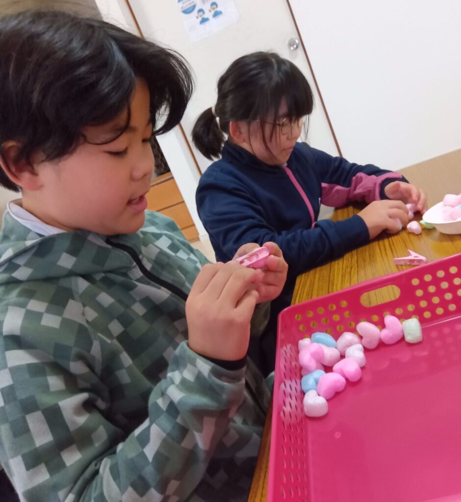 お箸を使うゲームでは、最初 つるつるとしたピンポン玉をつかむことに難しさを感じてましたが、「ゆっくりやってみようかな」「持ち方はこうかな?」と、自分たちで工夫しながら何度もチャレンジ🔥つかめた時には嬉しそうな表情を見せ、自信につながっている様子も見られました✨