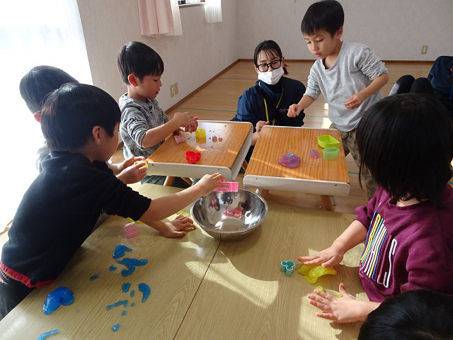 自分で色を決めたり、材料を線ピッタリに注いだり、カップを持って優しく混ぜたり楽しんで活動を行いました。