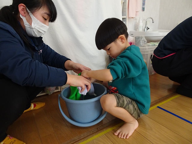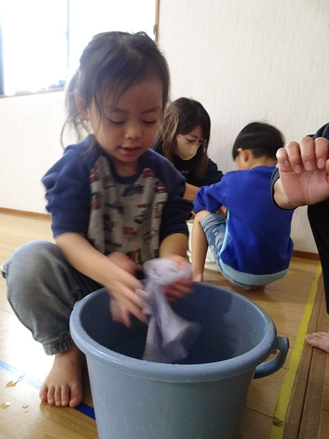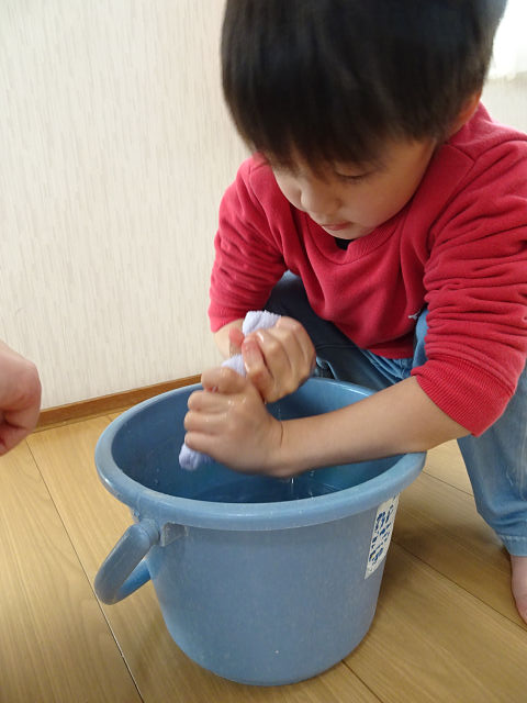 午前中(~年中さん)の子ども達のめあては「雑巾絞りの経験を重ねよう」でした。