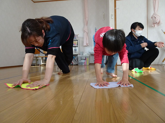 床を拭く時にはお尻を上げて拭く汽車拭きにも挑戦しましたが、みんなとっても上手でした👏