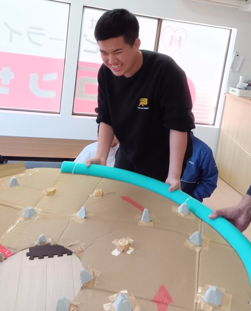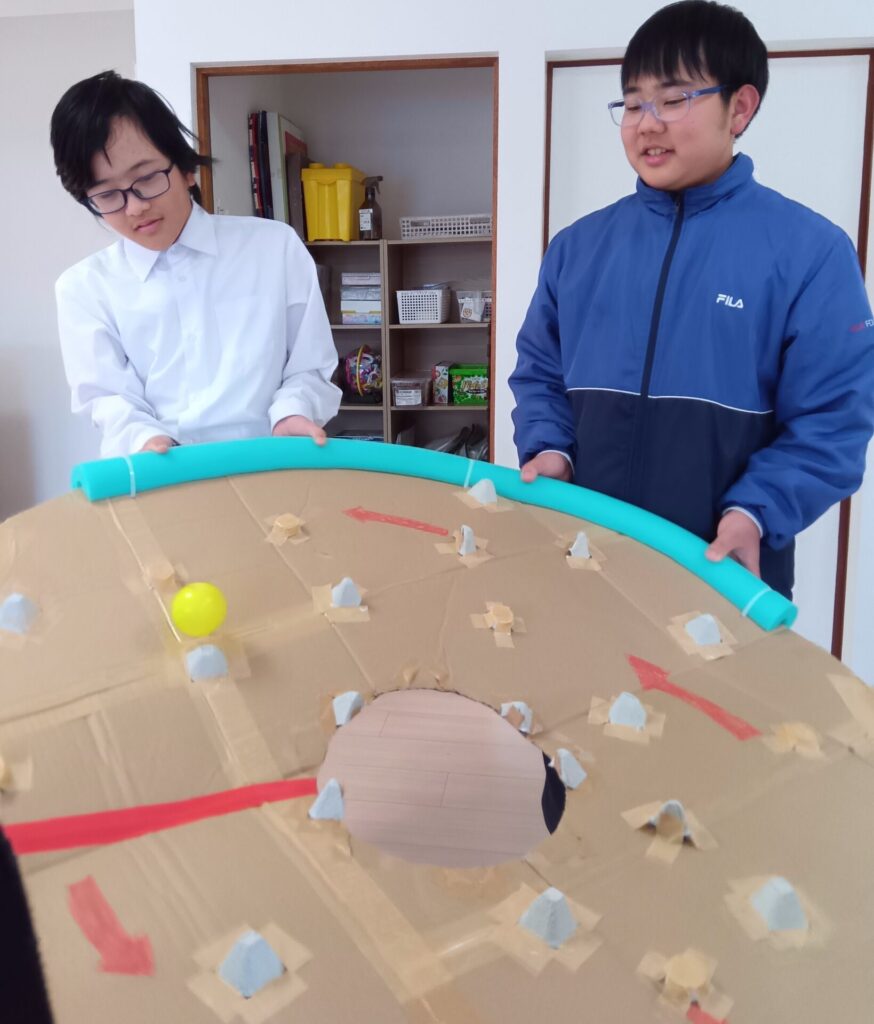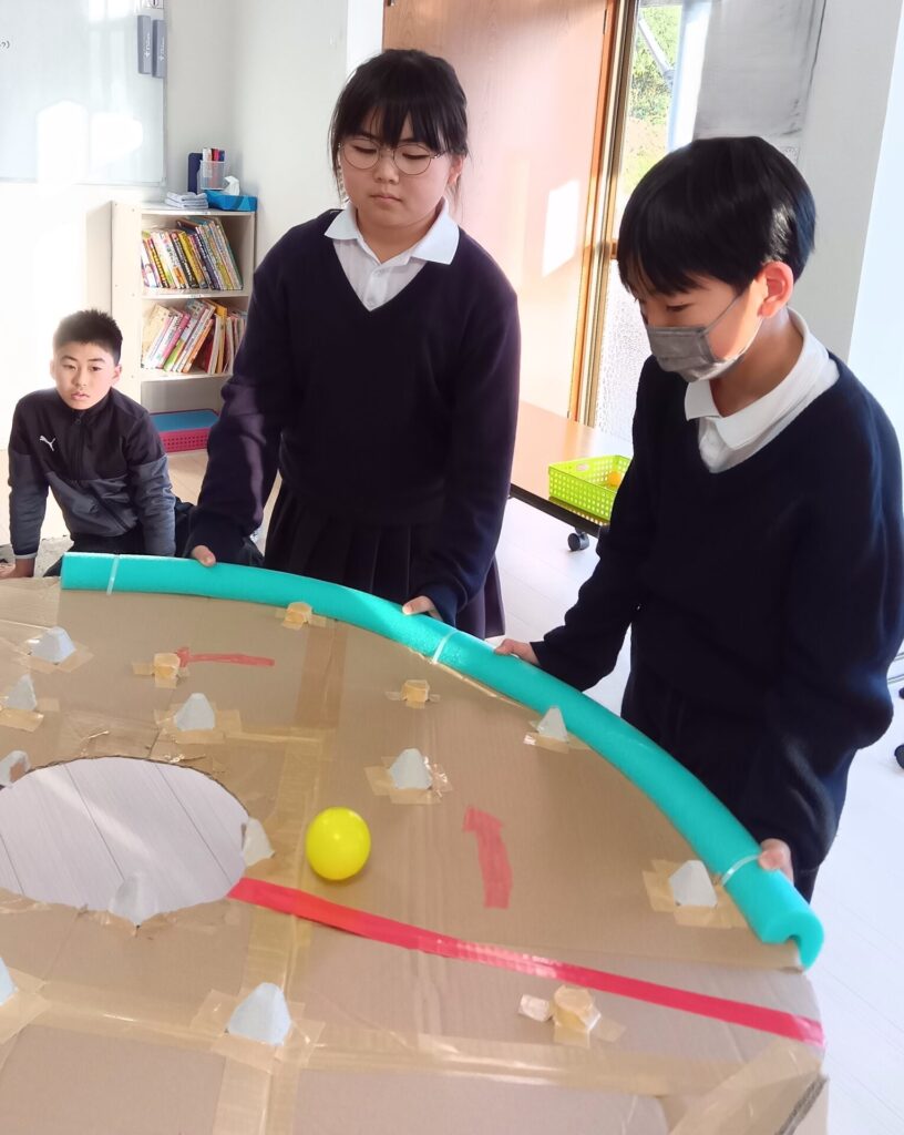 この活動は、グループのお友だちと声を掛け合いながら協力してボールを落とさないようにコースを傾けてボールをたくさん周回させるゲームです。