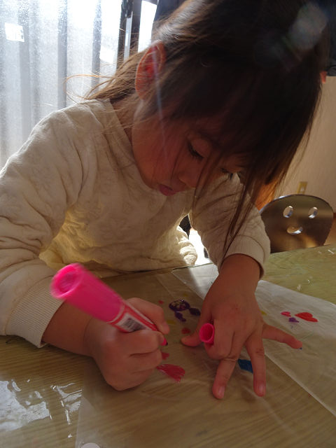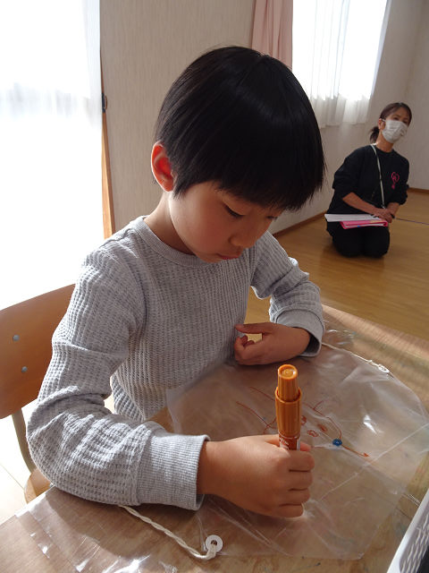 ビニールに絵を描きストローで骨組みを貼って凧を組み立てたり