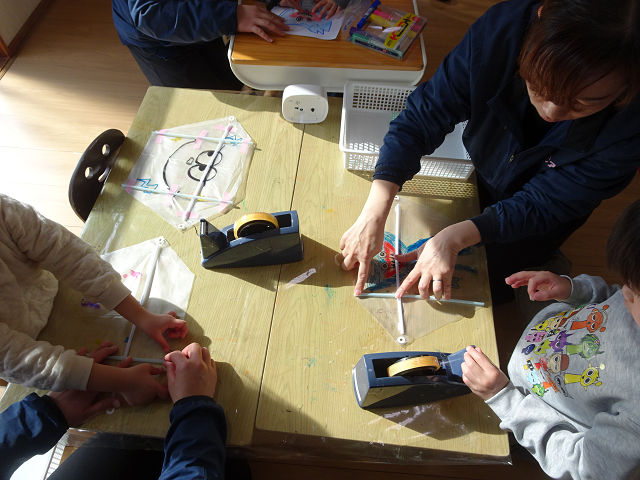 年長さんは凧の絵を描く時には描きたい絵を思うように形にするのが難しかった日もありましたが、気持ちを言葉で伝えるのが上手になり、見本を見る事や簡単な形で描いてみるなど話をすり合わせながら取り組みました。凧の骨組みを貼っていく際には、見本を見たり、自分で説明を思い出したりしながら取り組んでおり、作っていく過程で成長が見えてきて進級・卒園が近付いているのを身をもって感じました🤗🌈