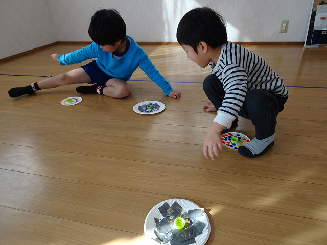 紙皿でコマを作ったり