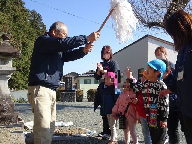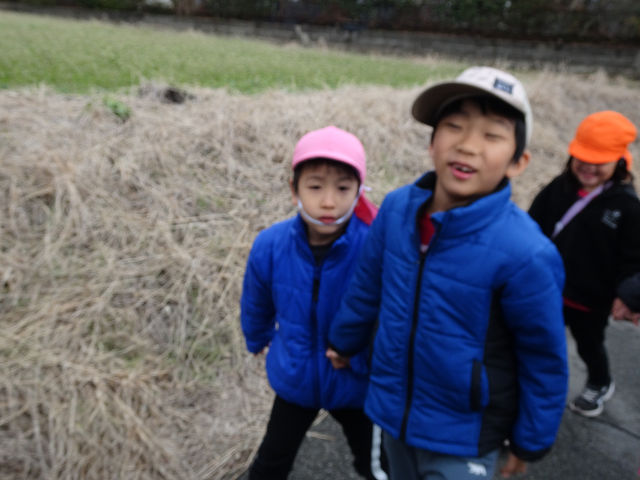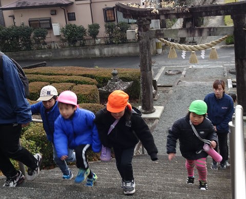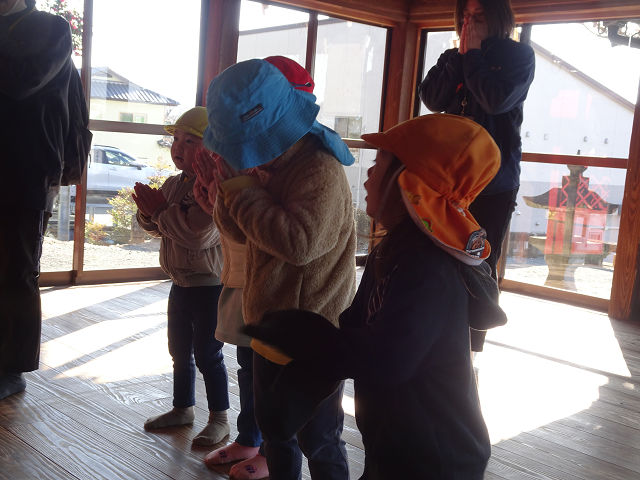 道中はお正月休みの間にあった家族とのお話を聞いたり、まだかな~?と神社の鳥居がいつ見えるのか楽しみにしながら歩いています。お正月はお餅がおいしかった!と教えてくれる子も多く、お餅の話でも盛り上がり海苔のお餅と甘いお餅(砂糖醤油)が子どもたち人気でした😋ちなみに職員の間では砂糖醤油のお餅に大根おろしが流行っていました😊💕試してみてくださいね😊笑